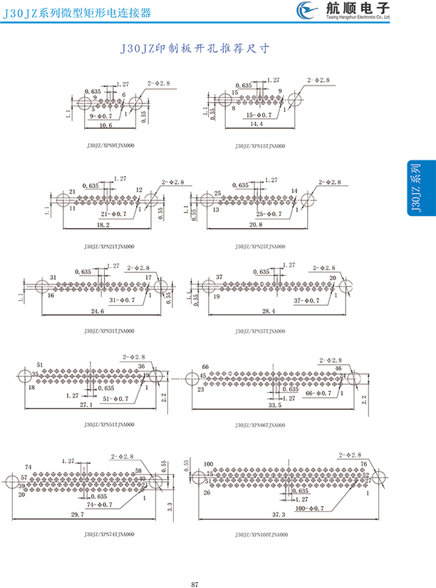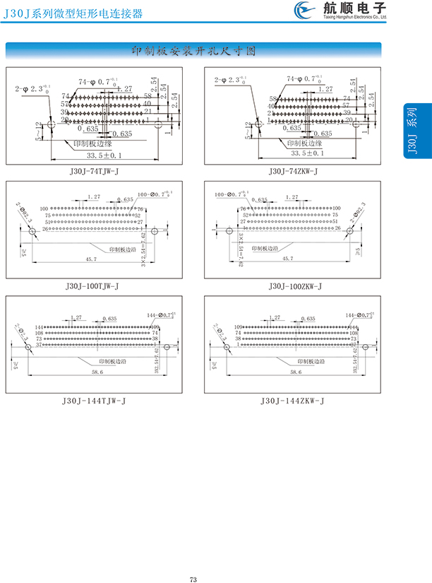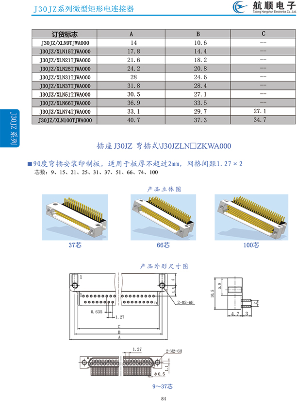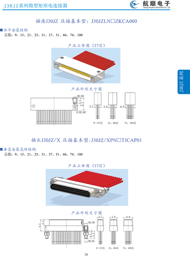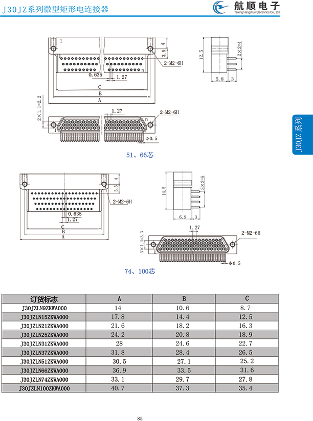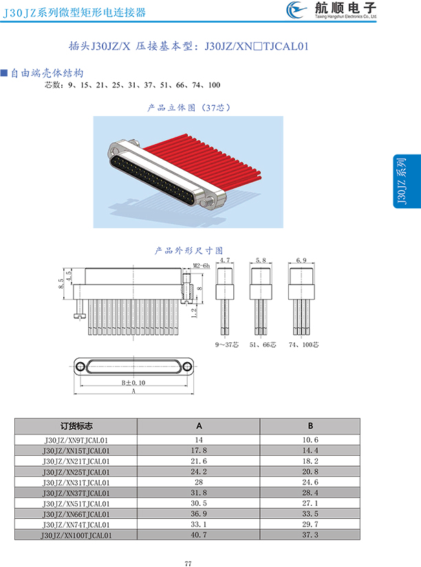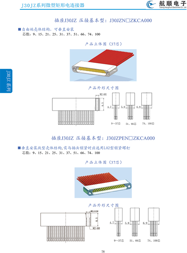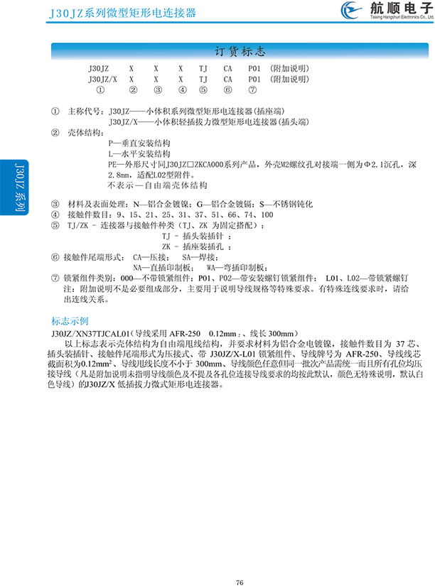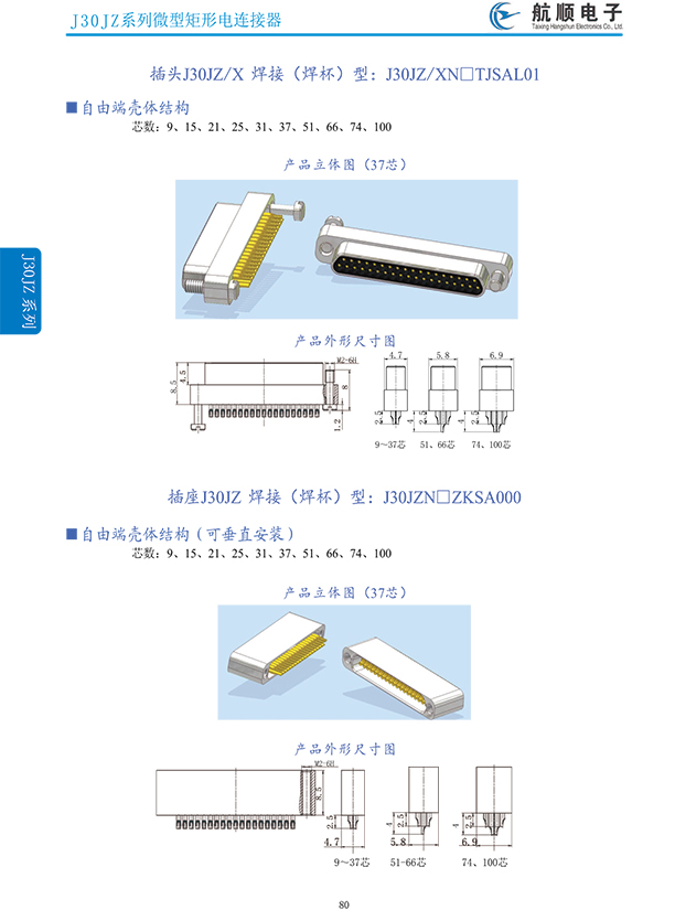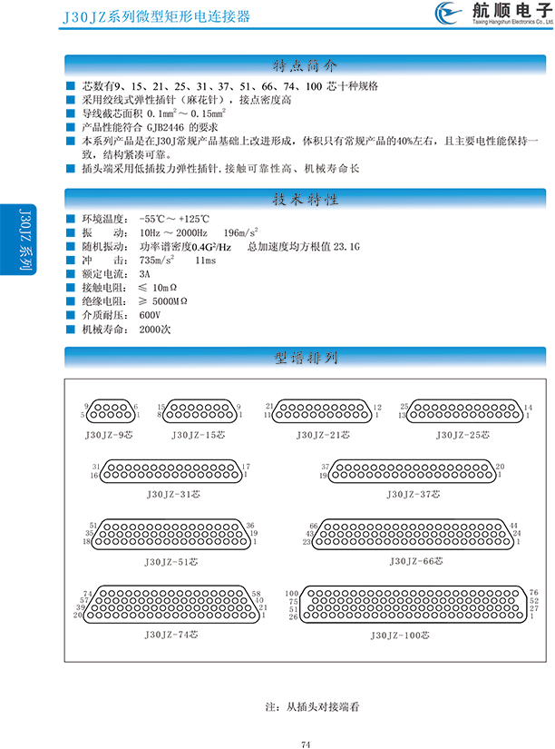 符合GJB2446《外殼定位超小型矩形電連接器總規(guī)范》(相當(dāng)于美軍標(biāo)MIL-C-83513),可與美國MDM系列產(chǎn)品和國內(nèi)同類產(chǎn)品互換,在J30系列產(chǎn)品的基礎(chǔ)上增 加了鋁合金外殼與各種鋁合金尾夾;采用絞線式插針 (俗稱麻花針),單個(gè)接觸件接觸點(diǎn)達(dá)七個(gè),提高了產(chǎn)品的接觸可靠性;采用1.27mm網(wǎng)格,接觸件密度大、體積小、重量輕;現(xiàn)有9、15、21、25、31、37、51、66、74、100芯共十種型譜可供選用;適用導(dǎo)線線芯 截面積為0.07~0.15mm2,尾端可以根據(jù)用戶要求進(jìn)行 布線;本產(chǎn)品的鎖緊組件按與產(chǎn)品組裝在一起提供,如不需鎖緊組件請?jiān)诤贤凶⒚?;本系列產(chǎn)品滿足GJB2446《外殼定位超小型矩形電連接器總規(guī)范》的 要求;本系列產(chǎn)品的執(zhí)行標(biāo)準(zhǔn)如下:Q/ZHDZ GC-18《J30J系列微矩形電連接器詳細(xì)規(guī)范》。